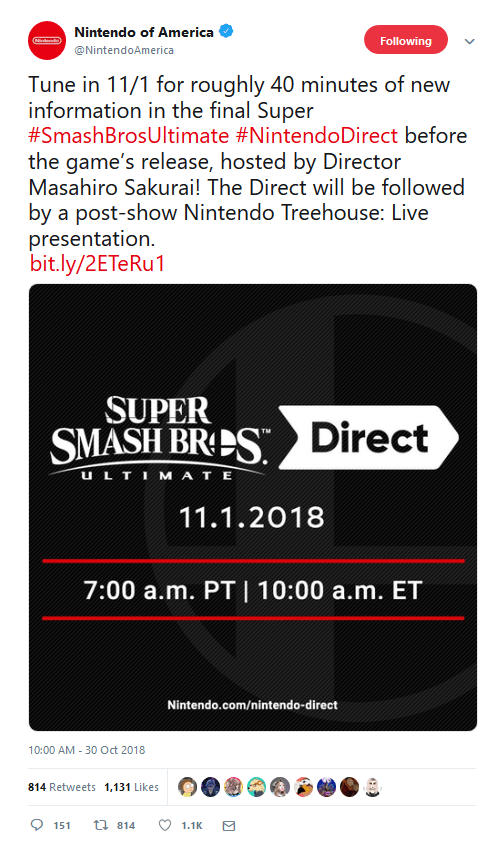 Nintendo has announced that there will be a Super Smash Bros. Ultimate Direct and a Nintendo Treehouse: Live Presentation on Thursday, November 1 at 7am PT/10am ET/3pm BST.